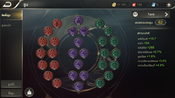 ROV ระบบ Rune ในเกมส์นี้เราจะให้เราได้เลือกใส่ 3 สี โดยมี Rune 3 เลเวลให้เราได้เลือกใช้ซึ่งค่าสถานะจากรูนเลเวล 3 จะค่อนข้างสูงมากทีเดียว ถ้ามีลูกเล่นในส่วนของรูนมากกว่านี้อีกนิดก็น่าสนใจทีเดียว