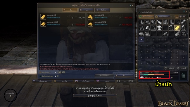 อันนี้ถือเป็นสิ่งที่ผู้เล่นใหม่จำเป็นต้องรู้เป็นอย่างมาก โดยภายในเกม Black Desert Online ทุกสิ่งทุกอย่างที่อยู่ในตัวละครของเราจะมีน้ำหนักทั้งสิ้นหรือก็คือ เงิน ชุดสวมใส่ ไอเทมต่างๆ ทุกอย่างจะมีน้ำหนักหมด ถ้าเพื่อนๆ คิดว่าจะเก็บเงินไว้ในตัวสัก 10 ล้าน 20 ล้านบอกเลยว่าเป็นไปไม่ได้อย่างแน่นอน ซึ่งตัวละครจะมีน้ำหนักหรือความจุของน้ำหนักที่จำกัด ดังนั้นเพื่อนๆ ต้องนำเงินไปฝากคลังหรือแลกเปลี่ยนเป็นทองภายในเกม เพื่อที่สามารถขนย้ายเงินที่มีจำนวนเยอะ ไปไหนมาไหนได้นั่นเอง และช่องเก็บของเป็นสิ่งที่จำเป็นมากๆ ในทุกสไตล์การเล่น คนที่ชอบการเก็บเลเวล หรือ คนทีชอบการทำ Life Skill กระเป๋าเก็บของถือเป็นสิ่งที่จำเป็นมากๆ เพราะมันจะทำให้เพื่อนๆ ไม่ต้องกลับเมืองบ่อยนั่นเอง
