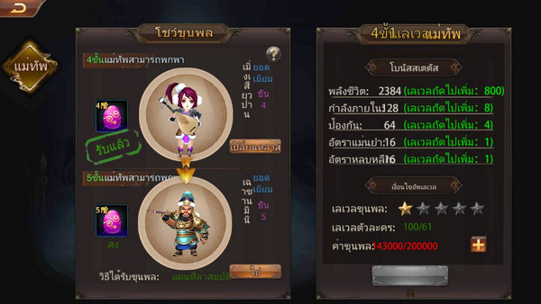 3. เมื่อระดับขุนพลเต็มในแต่ละขั้นก็จะสามารถเปลี่ยนขุนพลตัวใหม่ได้จากทางซ้าย เมื่ออัพ 1 ครั้งจะเพิ่ม 1 ดาว เมื่ออัพเต็ม 5 ดาวระดับขุนพลจะเพิ่มขึ้น 1 ขั้นและเปลี่ยนรูปร่างไปในแต่ละขั้นนั้นเอง