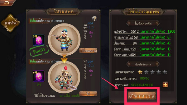 2. จะต้องมีค่าขุนพลในการอัพเกรด หาได้จากไอเทมคัมภีร์แม่ทัพ