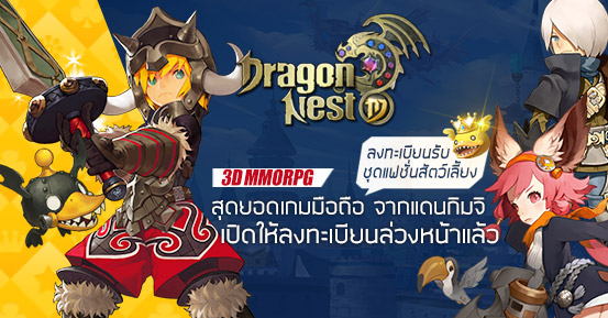 Dragon Nest M ได้เปิดกิจกรรมลงทะเบียนล่วงหน้าอย่างเป็นทางการแล้วตั้งแต่วันนี้ ลงทะเบียนปุ๊บก็รับไปเลยทันที “ชุดแฟชั่นสัตว์สุดน่ารัก” และหากผู้เล่นชวนเพื่อนผ่านลิงค์แชร์ในเฟสบุ๊กให้เข้าร่วมกิจกรรม ก็รับไปเลยหีบรางวัลมากมาย และเอาใจผู้เล่นเก่าของ Dragon Nest เพียงแค่กรอกข้อมูลที่เกี่ยวข้อง ก็รับไปเลยของรางวัลพิเศษทันที! ผู้เล่นสามารถเข้าไปอ่านรายละเอียดได้จากหน้ากิจกรรมหรือเฟซบุ๊กแฟนเพจตามลิงค์ด้านล่าง
