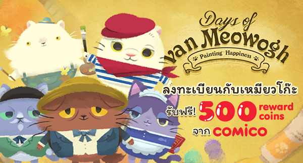 Day of van Meowogh เกมพัซเซิลสุดน่ารักที่มาพร้อมกับเรื่องราวอันแสนอบอุ่นหัวใจของจิตรกรแวนเหมียวโก๊ะที่มากความสามารถและผองเพื่อนของเขา ลงทะเบียนล่วงหน้า ต้อนรับการมาของภาษาไทย รับฟรี ของขวัญสุดพิเศษจาก Comico และ ไอเทมในเกมเพียบ