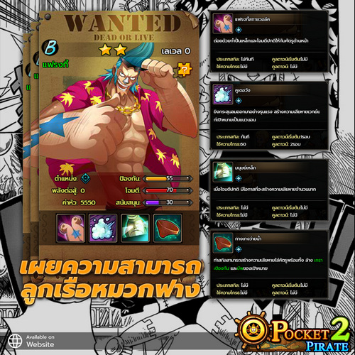 Pocket Pirate 2 เป็นเกมบนเว็บบราวเซอร์แนว Turn-Based จากอนิเมชั่นชื่อดังให้ผู้เล่นได้ผจญภัยไปสู่โลกโจรสลัดเพื่อตามหาสมบัติอันยิ่งใหญ่ด้วยตัวละครหลักสุดแกร่งทั้งหมด 4 อาชีพ ได้แก่ นักรบ , จอมเวทย์ , มือปืน และ หมอ