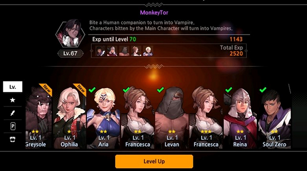 ในเกมนั้นจะมี 2 สถานะ หลักของตัวละครก็คือ มนุษย์ และ แวมไพร์ โดยที่ตัวละครทั่วไปปกติที่ได้รับมาจะมีสถานะเป็นมนุษย์ ส่วนตัวละครหลักของเราจะเป็นแวมไพร์ ซึ่งตัวละครหลักสามารถกัดมนุษย์เพื่อเพิ่มเลเวลและเปลี่ยนมนุษย์ให้กลายเป็นแวมไพร์ได้