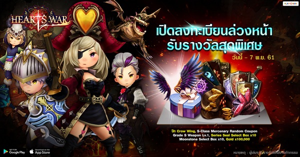 โดยก่อนที่จะเปิดให้เข้าไปมันส์กัน HeartsWar ได้มีกิจกรรม Pre-Register ให้ร่วมลงทะเบียนเตรียมรับไอเทมสุดเอ็กซ์คลูซีฟกันแบบฟรีๆ สามารถร่วมสนุกได้ตั้งแต่วันนี้เป็นต้นไป รายละเอียดเพิ่มเติม คลิ๊กที่นี่