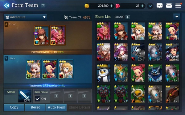 สำหรับการจัดทีม ผู้เล่นสามารถเลือกตัวละครลงต่อสู่ได้สูงสุดถึง 5 ตัว โดยมีการจัดทีมแบบหน้าและหลัง ซึ่งหากมีการจัดที่ดีมีการวางแผนแล้ว สแตทของบัฟต่างๆก็จะเพิ่มลดต่างกันไปนั่นเอง