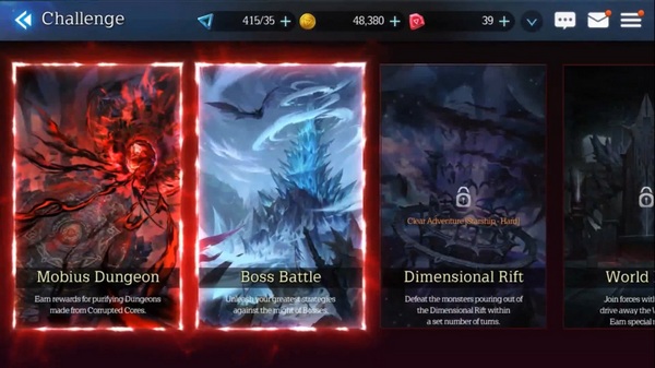โดยที่ผู้เล่นจะได้เจอทั้งด่านต่างๆในโหมดผจญภัย และดันเจี้ยนสุดโหดอย่าง Mobius Dungeon ในโหมด Challenge ที่ผู้เล่นสามารถสร้างขึ้นเองได้ โดยการใช้วัตถุดิบที่มี ในการสร้างเพื่อสุ่มดันเจี้ยนและบอสขึ้นมา รวมถึงดันเจี้ยน Boss Battle ที่ผู้เล่นจะได้เข้าไปเพื่อหาวัตถุดิบ หรือเครื่องสวมใส่ต่างๆได้นั่นเอง สำหรับโหมด Challenge นั้นยังมีอีก 2 ดันเจี้ยนให้ผู้เล่นได้เข้าไปปลดล็อคเพื่อร่วมสนุกและรับไอเท็มกันอีกมากมายย