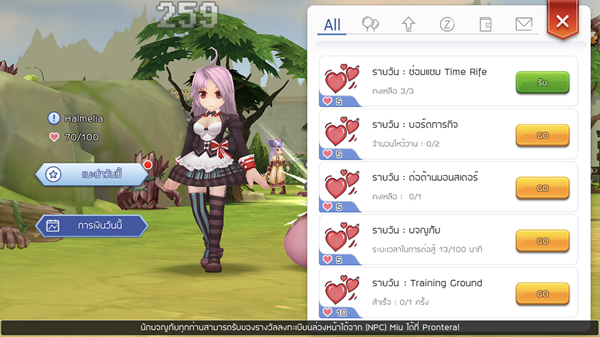 นอกจากนั้น ผู้ช่วย ยังมีเควสต์อีกหนึ่งรูปแบบที่ไม่ได้ให้เป็นไอเทมแต่ของ รางวัลเป็นหัวใจ ซึ่งเควสต์ในกลุ่มนี้จะเป็นพวกเควสต์รายวัน ไม่ว่าจะเป็นการทำ เควสต์ป้าย ลุยรอยแยก เควสต์ต้านทาน รวมไปถึง สังหารผู้เล่นในโหมด PVP เป็นต้น ซึ่งทั้งหมดล้วนแล้วแต่เป็นกิจกรรมที่เราควรทำให้ครบทุกวันอยู่แล้ว ก็เท่ากับว่าการไปรับตัวผู้ช่วยนั้นจะทำให้กิจกรรมที่เราทำทุกวันคุ้มค่ามากขึ้นจากของรางวัลที่เราได้รับ โดยเราจะต้องสะสมหัวใจให้ครบตามที่กำหนดเพื่อรับรางวัล ซึ่งเราสามารถกดรับรางวัลได้ที่ ผู้ช่วยได้เลย พอเรากดไอคอนผู้ช่วย ให้กดรับหัวใจจากเควสต์ที่เราทำเสร็จสิ้นแล้วในด้านขวา เมื่อมีหัวใจครบตามที่กำหนดในแต่ละขั้น ที่ตัวผู้ช่วยของเราจะปรากฏรางวัลในขั้นนั้นๆ ให้เราได้เห็นซึ่งของรางวัลจากผู้ช่วยมีอะไรบ้างตามมาดูเลย