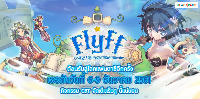 หลังจากที่ PlayPark.com ผู้ให้บริการเกมออนไลน์ชั้นนำในเครือ บริษัท เอเชียซอฟท์ คอร์ปอเรชั่น จำกัด (มหาชน) ได้ประกาศสร้างตำนานครั้งใหม่เกม Flyff ให้เหล่านักบินชาวไทยได้ FUN กันไปแล้วเมื่อวันที่ 30 ตุลาคม ที่ผ่านมา ตอนนี้ทีมงานก็ได้ประกาศกำหนดการ CBT (Close Beta) โดยจะเปิดให้มาร่วมผจญภัย วันที่ 6 – 9 ธันวาคม 2561 ซึ่งกำหนดการณ์โดยละเอียด มีดังนี้