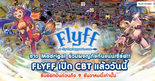 Flyff เกมออนไลน์ MMORPG สุดแบ๊วที่ใครก็บินได้ จาก PlayPark.com เปิด CBT แล้ววันนี้ เหล่า Madrigal ร่วมยกทัพกลับมาโบยบินกันแน่นเซิร์ฟ!! ใครอยากสัมผัสบรรยากาศความอบอุ่นที่ทุกคนเฝ้ารอ รีบติดปีกแล้วออกบินด่วน เปิด CBT ถึงวันที่ 9 ธันวาคมนี้เท่านั้น ใครที่ยังไม่มาร่วมบินไปด้วยกันดาวน์โหลดเลย