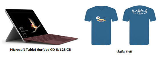 1. รางวัล Microsoft Tablet Surface GO ในกิจกรรม “ลัคกี้เกม กระดานมหาสนุก” (วันนี้ – 8 กุมภาพันธ์ 2562) เพียงแค่สะสมชั่วโมงการเล่น ครบทุก 1 ชั่วโมง เพื่อนๆ ก็มีสิทธิ์สุ่มกดรับรางวัล 1 ครั้ง (คะแนนจะอัพเดตในวันถัดไป) เพื่อสะสมคะแนน หรือลุ้นเป็นเจ้าของรางวัลใหญ่ Microsoft Tablet Surface GO นอกจากนี้ยังมีรางวัลเป็นเสื้อยืด Flyff และไอเทมพิเศษอีกเพียบ ประกาศรายชื่อผู้โชคดีวันที่ 15 กุมภาพันธ์ 2562 (http://bit.ly/newyear-party_flyff)