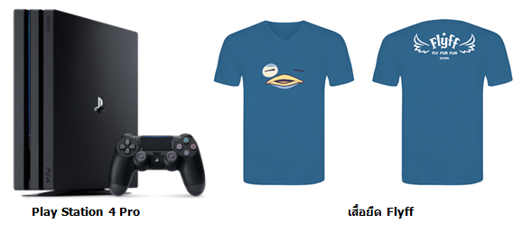 2. รางวัล Play Station 4 Pro จากกิจกรรม “เล่น Flyff ลุ้นรับฟรี PS4 Pro” (วันนี้ – 31 มีนาคม 2562) เพียงเก็บเลเวลตัวละครให้ถึง 20 ก็มีสิทธิ์รับรางวัลใหญ่กันไปเลย และทุกวันที่ 8 ของเดือนเพื่อนๆ จะได้รับไอเทมช่วยเล่นประจำเดือนฟรีอีกด้วย!! (เริ่มกดรับไอเทมได้ตั้งแต่วันที่ 8 กุมภาพันธ์ 2562) ประกาศผลผู้โชคดี 5 เมษายน 2562 (http://bit.ly/levelup20ps4pro)
