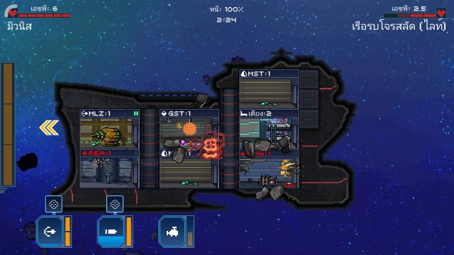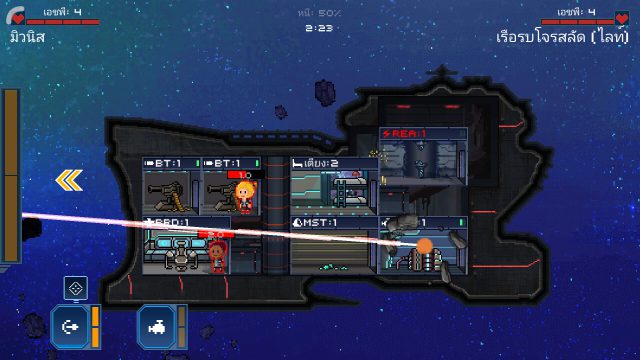 หรือเลือกโจมตีห้องอาวุธ จะทำให้อีกฝ่ายใช้อาวุธยิงโต้ตอบไม่ได้เช่นกัน แต่หากเราเป็นฝ่ายโดนยิงห้องพลังงานหรือห้องอาวุธจนดับ ให้รีบนำลูกเรือไปที่ห้องพลังงาน หรือห้องอาวุธ เพื่อซ่อมแซมให้เป็นปกติ แล้วค่อยเปิดอาวุธยิงตอบโต้ แต่ระวัง! ลูกเรือของเราอาจตายได้ หากไปอยู่ตรงจุดห้องที่โดนโจมตี! และเมื่อโจมตีจน HP ของยานหมดภายในเวลาก็จะจมเรืออีกฝ่ายลงได้