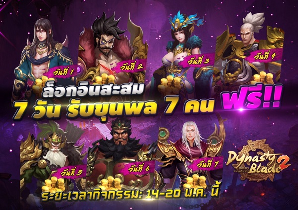 1) กิจกรรมล็อคอิน 7 วัน แจก 7 ขุนพล เพียงแค่ล็อกอินรับเหล่าวีรบุรุษแห่งสามก๊กไปเลยฟรีๆ พร้อมทองฟรีวันละ 50,000 เหรียญ