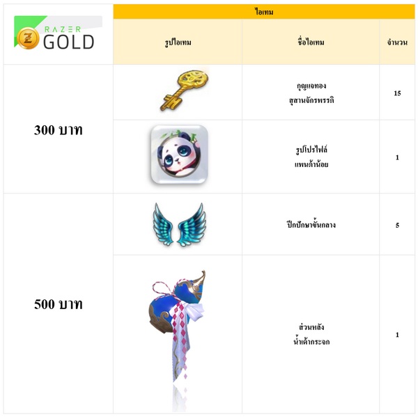 1. เติมเงินผ่าน RAZER GOLD ราคา 300 บาท และ 500 บาท เฉพาะช่องทาง Cash Card และ SMS จะได้รับ Code Item เพื่อนำไปเติมและรับไอเทมได้ในเกม