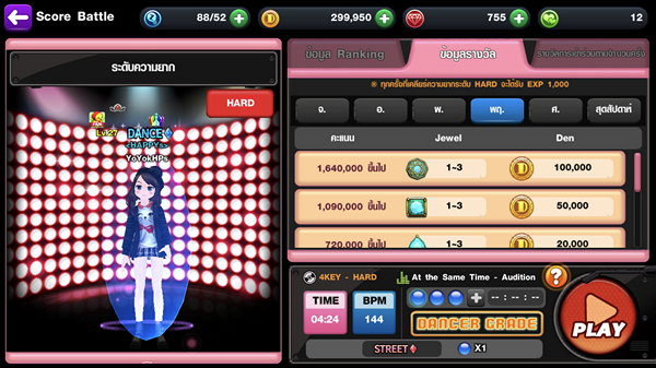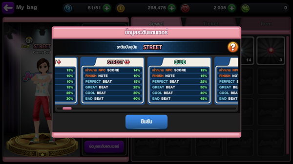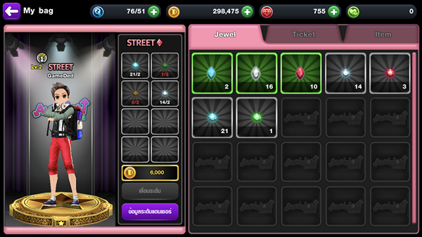 ดังนั้นสิ่งที่นักเต้นทุกท่านต้องรู้คือการที่ตัวละครมี ระดับแดนเซอร์ ต่างกันแม้จะกดได้ Perfect เหมือนกัน คนที่ระดับแดนเซอร์ต่ำกว่าจะได้คะแนนน้อยกว่า ได้ยินแบบนี้ก็อย่าเพิ่งนอยซ์ไป เพราะการของมาอัพระดับแดนเซอร์นั้นเราสามารถเลือกได้ 3 รูปแบบ ไม่มีเวลาแต่พร้อมเปย์กดไปเลยจร้ากับ กล่องสุ่ม Jewel แม้จะไม่ประหยัดเงินแต่ค่อนข้างประหยัดเวลาเอามากๆ เลยทีเดียว ระดับเทพตัวจริงลุย Score Battle เล่นแต่ละรอบรับไปเลยทั้ง EXP และ Jewel แบบเป็นกอบเป็นกำ ยิ่งคะแนนสูงยิ่งได้มาก คะแนนสูงติดชาร์ตรับไปเลยโบนัส Jewel และ เงิน Den อีกต่อ วิธีสุดท้ายสุดเบสิค กับการ ตะลุยด่านเนื้อเรื่อง อยากได้ Jewel แบบไหนก็ดูได้เลยก่อนเข้าเล่นด่านเนื้อเรื่อง หรือจะกดที่ Jewel ที่เราต้องการหาในหน้ากระเป๋าจะมีบอกทันทีว่าเราสามารถหามันได้จากที่ไหนบ้าง
