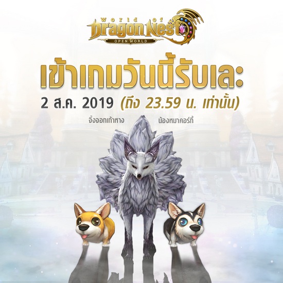 สำหรับใครที่ล็อกอินเข้าเกมในวันที่ 2 ส.ค. 2019 (ภายใน 23.59 น.) รับของรางวัลสุดพรีเมียมไปเลยฟรี! ทั้งสัตว์ขี่จิ้งจอกเก้าหาง, สัตว์เลี้ยงน้องหมาคอร์กี้ ซึ่งน่ารักและพิเศษสุดๆ เพราะใช้เพชรซื้อไม่ได้นะจ้ะ