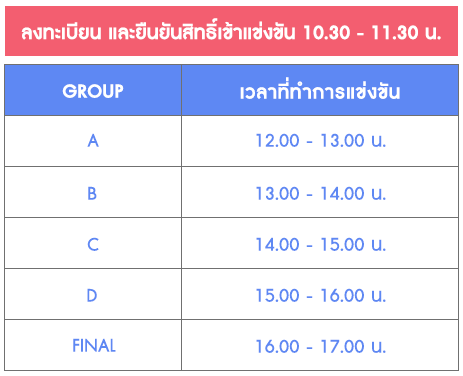 ● ผู้เข้าแข่งขันต้องมารายงานตัว เพื่อทำการแข่งตามกำหนดการที่ได้นัดหมายกันไว้