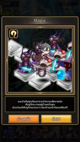 Magic Dicer (รูปไม้เท้า) : โจมตีพื้นที่ด้านหน้า (กว้าง 3 ช่องx ยาว 2 ช่อง) แล้วเดินตามจำนวนเท้าไดเซอร์