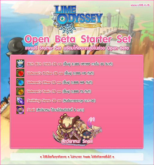 เปิดประตูต้อนรับเข้าสู่ช่วง Open Beta 12 มกราคม ท้าเหล่าเกมเมอร์ร่วมพิสูจน์ความมันส์ในเกมส์ Lime Odyssey ด้วยกิจกรรมแรงโดนใจ เพียงสมัคร ID และสร้างตัวละครเข้าเล่นเกมส์ในช่วงเวลากิจกรรม รับไปเลย Starter Set ชุดบิ๊กเบิ้ม แจกไม่อั้น ทั้ง Potion สำหรับใช้ยามจำเป็น ไปจนถึงพาหนะสุดแรร์จากแพทช์ใหม่ล่าสุดไม่ซ้ำใครอย่าง Snail อีกด้วย งานนี้เล่นก่อนก็ได้มันส์ก่อนถึง 1 กุมภาพันธ์ศกนี้เท่านั้นจ้า