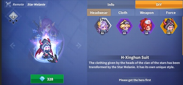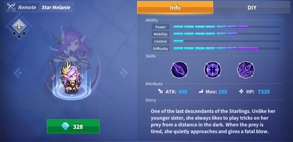 ตัวละครใหม่ Star Melanie เป็น Hero สาย Shooter ที่มีสเตตัสเริ่มต้นอยู่ที่ ATK 400, MOV 105 HP 7,335