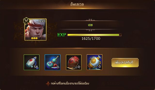 คนเล่นจะสามารถใช้ไอเท็มที่ชื่อ สุรา ในการอัพเลเวลตัวละครได้โดยการกดปุ่มในภาพ โดยตัวละครจะไม่สามารถอัพเลเวลได้เกินกว่าเลเวลของคนเล่น สำหรับตัวละคนที่คนเล่นจะวางไว้เป็นแนวหน้า แนะนำให้อัพให้เต็ม MAX