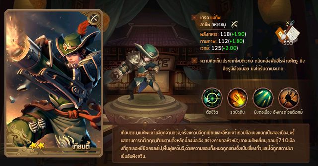 เทียนตี้เป็นตัวละครสายโจมตีระยะไกลที่เน้นการยิงไกลๆ โดยเฉพาะ ความโดดเด่นก็คือจะมีสกิลโจมตีที่รุนแรงเยอะมากแถมสามาถรผลักให้อีกฝ่ายกระเด็นออกไปได้ด้วย ถ้าต้องเอาไปสู้กับศัตรูที่ถึกๆ หรือระดับบอสแนะนำให้เอาติดทีมเอาไว้ ตัวละครตัวนี้แนะให้วางแนวหลังตัวละครที่ถึกๆ อย่าง เลอหยี่