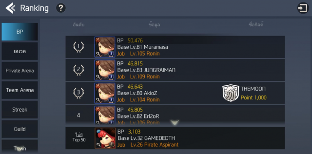 Guild แสดงอันดับ Guild ที่เลเวลมากที่สุด