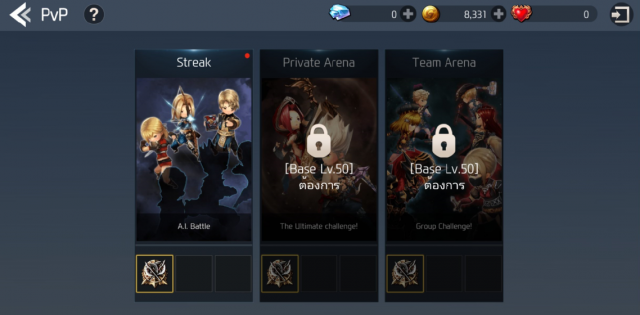 ในเกมนี้ระบบ PVP จะมี 3 โหมดให้เล่น ได้แก่ “Winning Streak” และ “Arena” ซึ่งทั้ง 2 โหมดนั้นจะมีวิธีการเล่นที่แตกต่างกัน แต่ทั้งคู่สามารถเข้าเล่นได้ผ่านเมนู Battlefield -> PvP