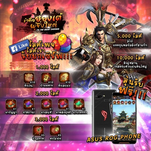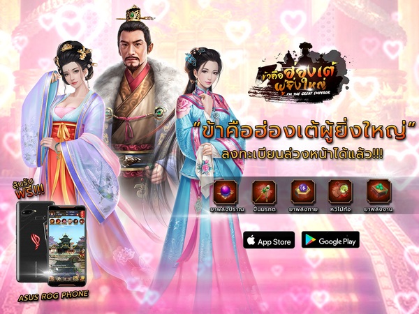 เรียนใต้เท้าทุกท่าน วันนี้ข้าน้อยมีข่าวดีมาบอกเนื่องจากใกล้ได้เวลาที่จะเดินทางสู่แผ่นดินมังกรที่มีชื่อว่า “ข้าคือฮ่องเต้ผู้ยิ่งใหญ่” ทางทีมงานจึงใคร่ขอเรียนเชิญใต้เท้าทุกท่าน ตบเท้าเดินมาทางนี้ เพื่อเตรียมเข้าสู่ดินแดนแห่งใหม่ แน่นอนว่าข้าน้อยคงไม่ให้ใต้เท้าลงทะเบียนเฉยๆ โดยไม่ได้อะไรติดไม้ติดมือแน่นอน เพราะหากใต้เท้าลงทะเบียนตอนนี้ ใต้เท้าจะได้รับรางวัลมากมายและพิเศษ! กิจกรรมแจกของรางวัล สุดยอดมือถือสำหรับคอเกมเมอร์ ASUS ROG PHONE ติดตามต่อท้ายข่าว