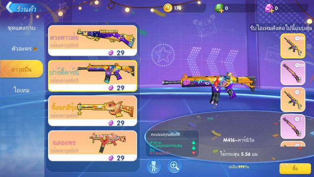 - มีสกินให้เลือกซื้อและบางชุดเพิ่มเอฟเฟคด้วย