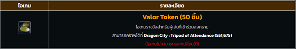 ต่อด้วยกิจกรรม Let’s join the Nation War เข้าร่วมสงครามเนชั่นทุกวัน รับรางวัลพิเศษเพิ่มไปเลย Valor Token จำนวน 50 ชิ้น เพียงแค่ผู้เล่นจะต้องมีการ Active ภายใน Nation War และจะต้องได้รับ Valor Token หลังจบสงคราม อย่างน้อย 1 ชิ้น จึงจะได้รับรางวัลพิเศษจากกิจกรรม เริ่มแล้วตั้งแต่ วันนี้ – 23 สิงหาคม 2564 ดูรายละเอียดกิจกรรมเพิ่มเติมได้ที่ https://bit.ly/3jaBgnm