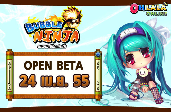 ซึ่งจากเดิมจะทำการเปิด Open Beta หรือ OB ในวันที่ 23 เมษายน 2555 และจะขอเลื่อนไปเป็นวันที่ 24 เมษายน 2555 (เวลา 14.00 น.) เพื่อทำการปรับปรุงเซิร์ฟเวอร์ให้สมบูรณ์ที่สุด เกม Bubble Ninja เป็นเกมที่เล่นง่ายๆ ผ่านเว็บ ไม่ต้องดาวน์โหลดให้เสียเวลา