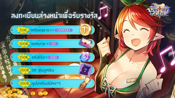 กิจกรรมลงทะเบียนล่วงหน้าบนเว็บไซต์ทางการของ Destiny Girl ก็เปิดแล้วเช่นกัน! ตั้งแต่วันที่ 3 มีนาคมเป้นต้นไป คุณสามารถเข้าสู่เว็บไซต์ทางการและเข้าร่วมกิจลงทะเบียนล่วงหน้าเพื่อรับของขวัญสุดหรูที่มีมูลค่า $88!