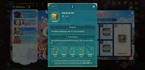 วิธีแรกนั้นเรียกว่าได้แน่ๆ ได้ชัวร์ๆ ไม่ต้องลุ้นแค่ Log in ให้ครบ 7 วัน โดยในวันที่ 7 จะได้รางวัลเป็น กล่องอาวุธ 4 ดาว ที่จะสุ่มอาวุธ 4 ดาวให้เรา 1 ชิ้น จาก 5 ธาตุ โดยจะมีอัตราได้รับคือ ธาตุไฟ 25%, ธาตุน้ำ 25%, ธาตุลม 25%, ธาตุแสง 12.5% และ ธาตุมืด 12.5% อาวุธในกล่องนี้จะไม่ สุ่มอาวุธแบบ 4 ดาวหายาก มาให้เรา ซึ่งธาตุที่ทุกคนคาดหวังจะได้คงหนีไม่พ้น อาวุธธาตุแสง และ มืด ที่จำเป็นในช่วงท้ายเกมส์มากกว่าอาวุธธาตุชนิดอื่น