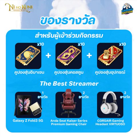 ประกาศรายชื่อผู้โชคดี : 12 กรกฎาคม 2565 ประกาศผลผู้โชคดีผ่านไลฟ์สตรีมของเพจ Ni no Kuni: Cross Worlds