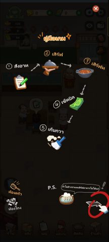 ซึ่งหม้อเบสน้ำซุปและชุดอาหารจะมีเวลา Cooldown ให้เราเห็นว่าเสร็จเมื่อไหร่ เมื่อเสร็จแล้วแตะที่หม้อเพื่อเสริฟ ส่วนชุดอาหารจะต้องใช้เวลาเตรียมของตามที่ลูกค้าสั่ง ถ้าซัก 10 อย่างก็ต้องเตรียมของ 10 ชนิด แล้วชุดอาหารที่เตรียมเสร็จจะอยู่ที่ถาดอาหาร แตะเพื่อเสริฟ