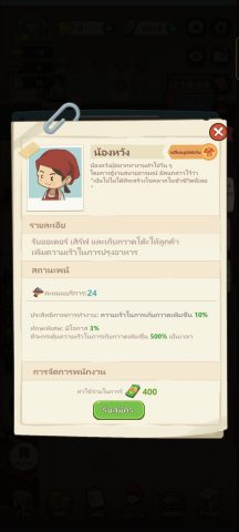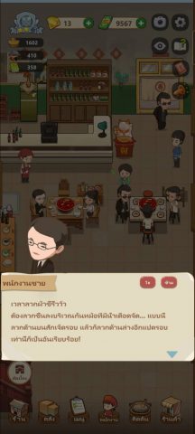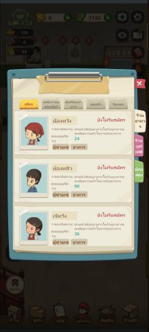 – รับแขก : พนักงานต้อนรับที่หน้าประตู มีสกิลเพิ่มความเร็วให้ลูกค้าเข้าร้านเพิ่มขึ้น