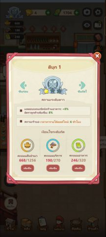 – อัพเกรดระดับร้าน : ประกอบด้วย คะแนนสิ่งอำนวยความสะดวก(ของตกแต่งร้าน) ,คะแนนบริการ(คนบริการ) และ คะแนนอาหาร (อัพเกรดอาหาร) เมื่อสะสมแต้มจนครบร้านเราจะได้เลื่อนระดับร้านให้ Rank สูงขึ้น ปลดล็อคของมากขึ้น
