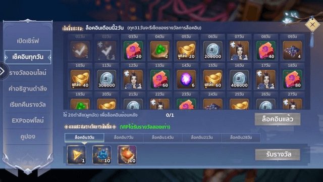 รับของได้ที่เมนู รางวัล>เช็คอินทุกวันและกดที่ปุ่มล็อคอินเพื่อรับไอเทมรางวัล