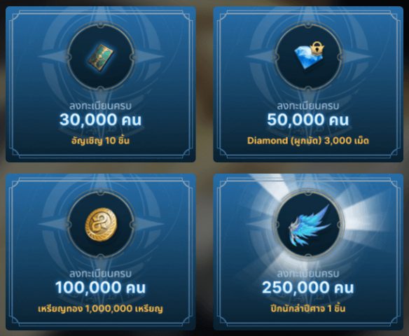 โดยเปิดให้ร่วม ลงทะเบียนล่วงหน้าบนเว็บไซต์ แล้วตั้งแต่วันนี้ ทุกคนที่ลงทะเบียนจะได้รับ ไอเทมอัญเชิญ, เพชร, เหรียญทอง และ ปีกนักล่าปีศาจ ตามลำดับ พิเศษ! หากลงทะเบียน ครบ 500,000 คน รับไปเลย “สัตว์ขี่กวางหิมะ SSR” ของรางวัลทั้งหมดจะส่งเข้าตัวละครให้ทันทีเมื่อเกมเปิด OBT