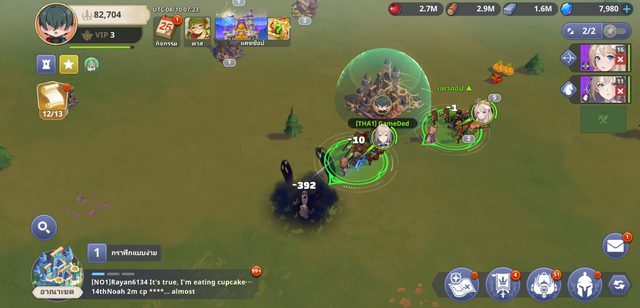 การต่อสู้ในแผนที่โลก ที่มีความแตกต่าง โดยปรกติในแผนที่โลกจะมีสิ่งต่างๆ ให้เราเข้าโจมตีทั้ง มอนส์เตอร์, สถานที่ฟาร์มทรัพยากรชนิดต่างๆ แต่ในโลกแห่งนี้จะมี หอคอย, ประตูเมือง และ ปราสาทใหญ่ ที่เราสามารถเข้ายึดครองได้ โดยเราจะได้เห็นความแตกต่าง ในการต่อสู้อย่างการ ส่งทหารออกไปตั้งทัพรอ ในแผนที่ แล้วค่อยส่งทัพนั้นไปโจมตีทั้ง มอนส์เตอร์ แหล่งทรัพยากร อาคารต่างๆ หรือแม้แต่เมืองของผู้เล่นอื่น ทำให้เราสามารถจัดลำดับในการโจมตีได้อย่างง่ายดาย