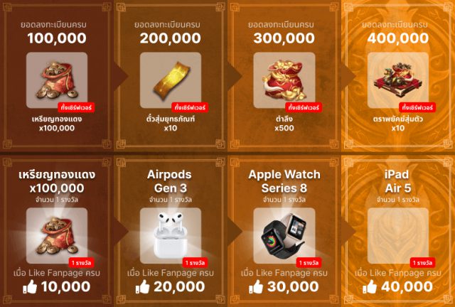 เพียงลงทะเบียนหน้าล่วงหน้าบนเว็บไซต์ และเล่นเกม Samkok Tactics M ถึง เลเวล 10 มีสิทธิ์ รับรางวัลทองคำมูลค่า 10,000 บาท จำนวน 10 รางวัล รวมมูลค่ากว่า 100,000 บาท!! (ประกาศรายชื่อผู้โชคดี 16 ตุลาคม 2566)