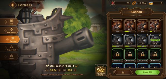 ไม่เพียงแต่ตัวป้อมปราการเท่านั้นที่เราสามารถอัพเกรดได้ เรายังสามารถสุ่มหา ปืนใหญ่, ฮีโร่ และ แมวผู้ช่วย มาช่วยเสริมความแข็งแกร่งให้ป้อมปราการของเราได้อีกด้วย โดยเหล่าฮีโร่นั้นจะมีทั้งแบบ โจมตีระยะไกล และ ระยะใกล้ ซึ่งพวกตัวตีใกล้จะลงไปเป็นกองหน้าให้เราได้ก่อน ทำให้ศัตรูตีป้อมของเราไม่ได้ ส่วนตัวตีไกลจะช่วยเรายิงจากบนป้อม หรือหากเป็นนักเวทย์ก็ใช้สกิลอยู่บนป้อมเช่นกัน