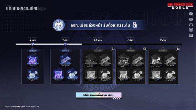 One Punch Man: World ได้เตรียมรางวัลลงทะเบียนไว้มากมายให้แก่ผู้เล่น! นอกจากไอเทมพื้นฐานอย่างอินเทลและเหรียญเงินฮีโร่แล้ว เมื่อจำนวน ผู้ลงทะเบียนถึง 1 ล้าน, 1.5 ล้าน, 2 ล้านยังจะมอบสิทธิ์เปิดเผย (ตั๋วสุ่ม), พื้นหลังนามบัตร และ อิมเพรสชันอาร์มส์ SR แบบสุ่มของ One Punch Man: World และ เมื่อจำนวน ผู้ลงทะเบียนทะลุ 3 ล้าน จะเพิ่มรางวัลมากขึ้นอีก โดยผู้เล่นจะได้รับสิทธิ์ เปิดเผย*10 พร้อมตัวละคร ไซตามะ – ชายว่างงานฟรีอีกด้วย! รีบไปยังเว็บไซต์ออฟฟิเชียลเพื่อลงทะเบียนล่วงหน้ากัน แล้วมากำจัดมนุษย์ประหลาดไปกับไซตามะด้วยกันเลย!