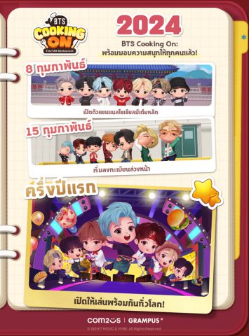‘BTS Cooking On‘ เป็นเกมที่พัฒนาขึ้นโดย Grampus และเตรียมเปิดให้บริการโดย Com2uS ตัวเกมจะดำเนินไปโดยให้ผู้เล่นและเหล่า TinyTAN ซึ่งเป็นตัวละครของวงบอยกรุ๊ป BTS ท่องเที่ยวไปตามเมืองต่าง ๆ ทั่วโลกและเปิดร้านขายอาหารจานเด็ดของประเทศนั้น ๆ Grampus นั้นได้ชื่อว่าเป็นผู้เชี่ยวชาญในการพัฒนาเกมทำอาหารชื่อดังอย่าง ‘Cooking Adventure‘ และ ‘My Little Chef‘ ที่มียอดดาวน์โหลดทั่วโลกสูงถึง 33 ล้านครั้ง เมื่อผนึกกำลังกับ ‘TinyTAN’ ตัวละครสุดน่ารักของวง BTS แล้ว ทำให้ได้รับความสนใจอย่างล้นหลามจากคอเกมทั่วโลกและแฟน ๆ K-POP