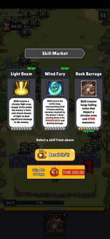 นอกจากการเลือกฮีโร่เรายังต้องเลือก เวทย์มนต์ ที่มีหลายสายได้แก่ ดิน, น้ำ, ลม ไฟ, แสง, มืด และ ตำนาน แต่ละสายจะมีหลากหลาย Skill ให้เราเลือกใช้ ก่อนเข้าต่อสู้เรา สามารถเลือก 4 Skill ลงสนามไปพร้อมเราได้ หลังจากนั้นเมื่อจัดการมอนส์เตอร์ลงจนเกจเต็ม จะมีการสุ่ม 3 Skill มาให้เราเลือกไปใช้เพิ่มได้ครั้งละ 1 อย่าง แต่ละครั้งที่เราเลือกมาจะเป็นการเพิ่มจำนวนการใช้ให้ Skill นั้นได้หนึ่งครั้ง รวมถึงช่วยอัพเกรดความแรงให้ด้วย ไม่เพียงแค่โหมดเนื้อเรื่องเท่านั้นตัวเกมส์ยังมีระบบ ดันเจี้ยนรายวัน และ การสู้ Boss ให้เราได้ท้าทายในรูปแบบการเล่นที่ไม่ได้แตกต่าง แต่กลยุทธที่ใช้อาจต้องปรับเปลี่ยนไป