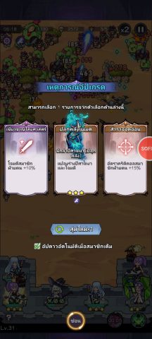เมื่อเก็บ EXP ได้จน LV UP จะสามารถเลือกการอัพเกรดได้ 1 ครั้ง ซึ่งจะมีตัวเลือกให้ 3 อย่าง ระหว่าง ปลุกแม่มดมาช่วยโจมตี หรือบัฟ สามารถเลือกตามใจชอบได้เลย แถบสีของบัฟที่เลือกจะบ่งบอกว่าอันไหนแรร์หรือธรรมดา เขียว>น้ำเงิน>ม่วง>ทอง หากเราเลือกแม่มดซ้ำกัน 2 ตัว สามารถรวมกันเพื่ออัพเกรดได้เป็น 2 ดาว และเอา 2 ดาว 2 ตัวรวมกันเป็น 3 ดาว 1 ตัวและสำหรับบัฟ จะแยกเป็น บัฟสำหรับตัวละครทุกตัว บัฟสำหรับสายอาชีพ และบัฟผู้บัญชาการ