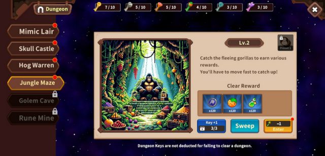 นอกจากการผ่านด่านในโหมดเนื้อเรื่องที่ฉากจะเปลี่ยนไปเรื่อยๆ ตามดินแดนที่เราไปถึง นอกจากนั้นยังมีดันเจียนทรัพยากรที่หลากหลายให้เราได้เข้าท้าทายรับทรัพยากรหลากหลายทั้ง Mimic Lair, Skull Castle, Hog Warren, Jungle Maze, Golem Cave และ Rune Mine ที่จะปลดล็อคเมื่อเราทำเควสต์ได้ถึงบทที่กำหนดไว้ นอกจากนั้นยังมีโหมด PVP ให้เราได้ลองฝีมือกับทีมของผู้เล่นคนอื่นด้วย