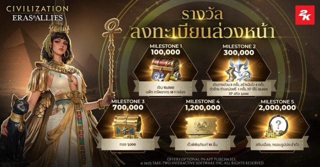 2K ประกาศเปิดให้ลงทะเบียนล่วงหน้าอย่างเป็นทางการสำหรับ Civilization: Eras & Allies เกมกลยุทธ์บนมือถือใหม่ล่าสุด ที่ได้รับแรงบันดาลใจจากแฟรนไชส์ยอดนิยมอย่าง Sid Meier’s Civilization®